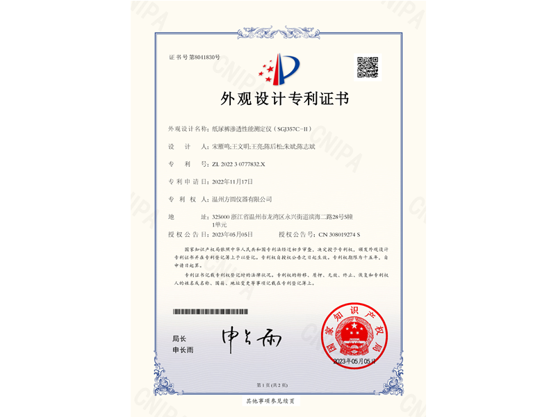 中國外觀設計專利:紙尿褲滲透性能測定儀(ZL 2022 3 0777832.X)