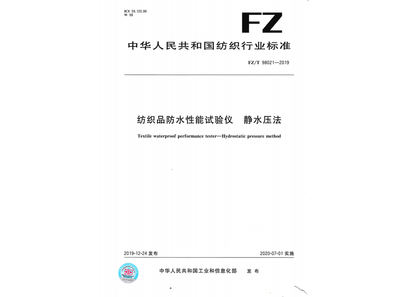 參與起草《紡織品防水性能試驗儀 靜水壓法》(FZ/T 98021-2019),該標準由中華人民共和國工業(yè)和信息化部于 2019-12-24 發(fā)布